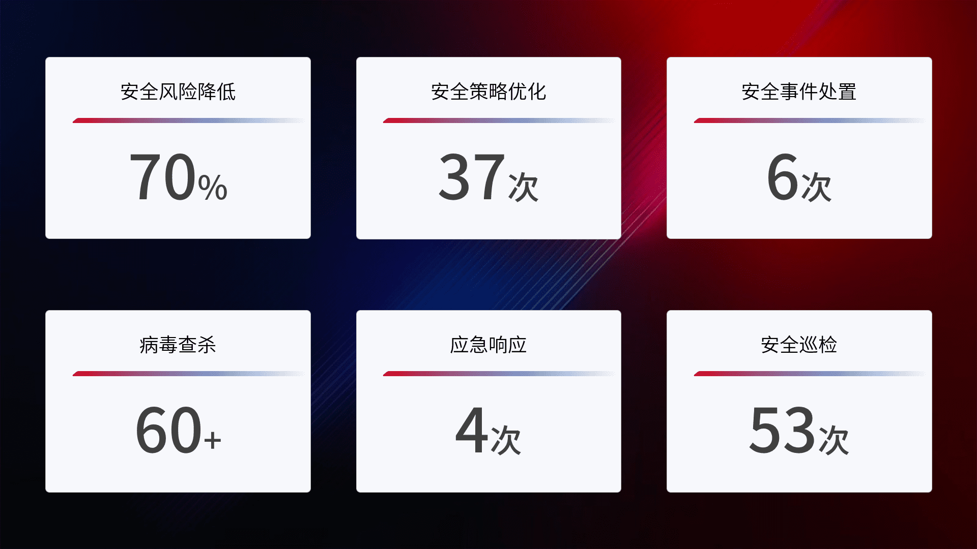 提供全面的安全事件报告体系,,,,包括处置报告、、周报、、、季度和年度总结,,结合持续监控,,,,帮助客户深入了解网络安全状况。。。。