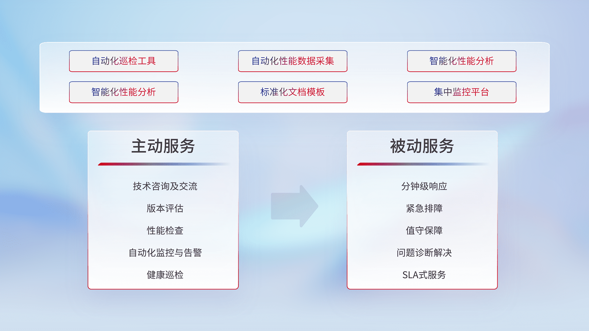 智能化工具和标准化文档,,,,保障服务质量,,提供主动服务(包含技术咨询、、、、版本评估、、、、性能检查、、自动化监控与告警、、、健康巡检)和被动服务包含(分钟级响应、、、紧急排障、、值守保障、、问题诊断解决、、SLA服务)。。。